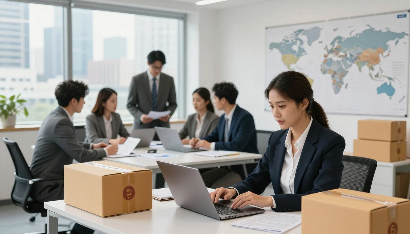 A vibrant, dynamic scene depicting the essence of international shipping and global market access. In the foreground, a professional businessperson wearing formal attire stands confidently next to a digital tablet displaying a world map with shipping routes highlighted. In the middle ground, cargo containers and a modern cargo ship symbolize the shipping industry, while diverse people from various backgrounds collaborate, discussing strategies and ideas. The background features a skyline of iconic global cities, representing international markets. Soft, warm lighting creates an inviting atmosphere, suggesting opportunity and connection. The angle is slightly elevated, providing a comprehensive view of both the business environment and the shipping landscape, fostering a sense of progress and innovation.