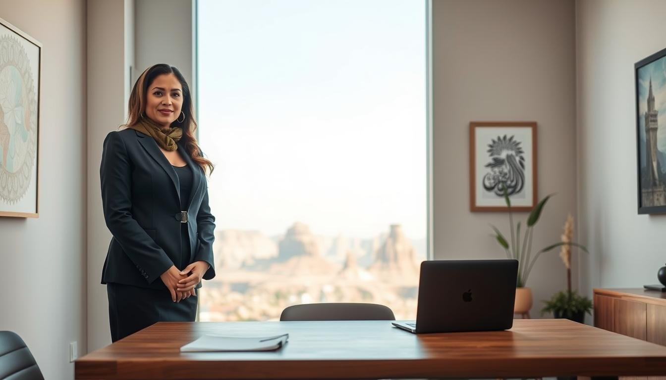 A professional business setting showcasing a prominent female figure, Abeer AlAkel, engaged in strategic discussions during a royal commission in Alula, Saudi Arabia. In the foreground, Abeer is portrayed in smart business attire, analyzing documents with a focused expression. The middle ground features a modern conference table, equipped with high-tech screens displaying graphs and strategic plans. The background captures the majestic landscapes of Alula, with its stunning rock formations and desert scenery visible through large glass windows, illuminated by warm, natural light flooding the room. The atmosphere is one of determination and innovation, conveying the significance of her achievements and initiatives in shaping the future of Saudi Arabia.