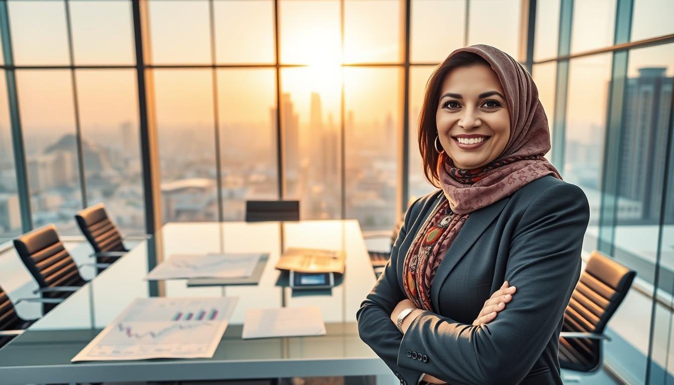 A professional portrait of Sarah Al-Suhaimi, the CEO of NCB Capital, in an elegant office setting. In the foreground, she is seated at a sleek modern desk, wearing a smart business suit, exuding confidence and poise. The middle ground features a large window showcasing a panoramic view of Riyadh's skyline bathed in warm golden-hour lighting, symbolizing growth and opportunity. In the background, subtle hints of financial graphs and charts are visible on a digital screen, emphasizing her achievements in growth management. The atmosphere is inspiring and professional, conveying success and leadership in the financial sector, with a soft focus on the office's contemporary decor. Use a 35mm lens for a slightly blurred background effect.