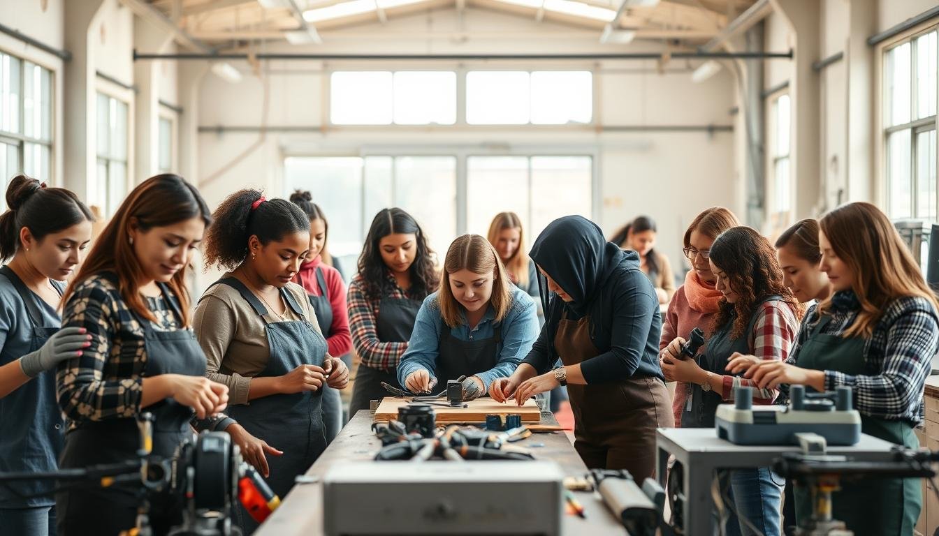 A well-lit, high-angle shot of a diverse group of women engaged in hands-on skills development activities. In the foreground, female students diligently working with power tools, circuits, and 3D printers, their faces focused and determined. In the middle ground, an instructor guiding and demonstrating techniques, their interactions energetic and collaborative. The background features a modern, well-equipped workshop setting with various workbenches, shelves of supplies, and inspirational posters on the walls, conveying a sense of innovation and opportunity. The overall mood is one of empowerment, as the women learn valuable technical skills that will prepare them for rewarding careers.